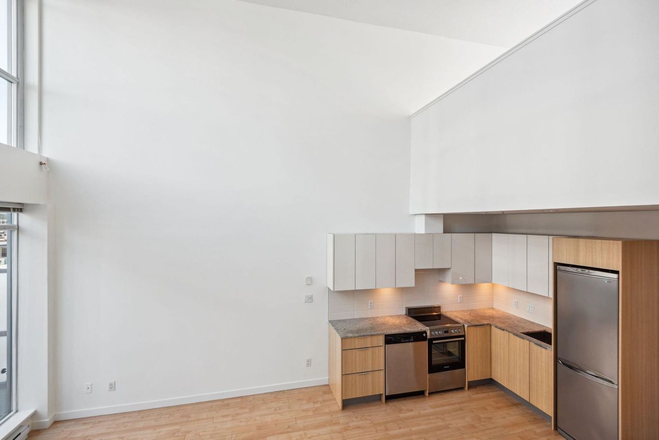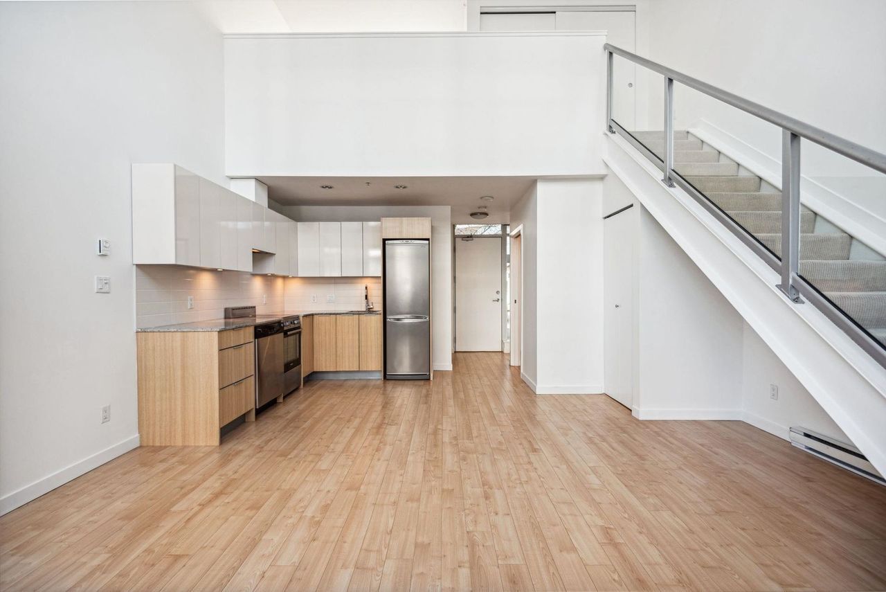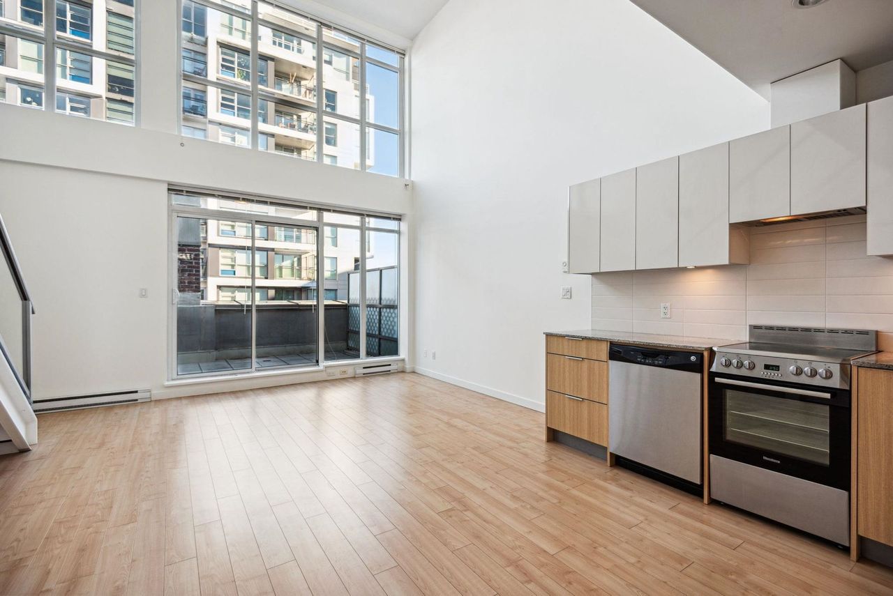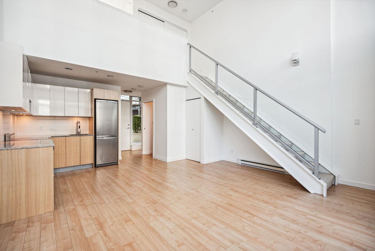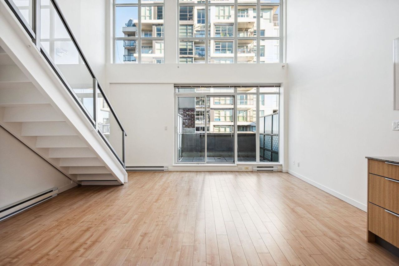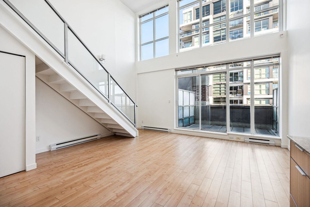 Stunning Two-Level Penthouse Loft at Maynards Block This one-of-a-kind modern penthouse loft sits atop a charming heritage brick building, featuring 17'6" ceilings, a striking double-height living room, and abundant natural light from its dual exposure. The spacious upstairs bedroom, two bathrooms, and sleek stone surfaces create a stylish, open-concept space. Enjoy a 118 sq. ft. walk-out patio with garden access. Two parking spaces included. Steps from Olympic Village, the SkyTrain, and the seawall. Call today to book your private showing!