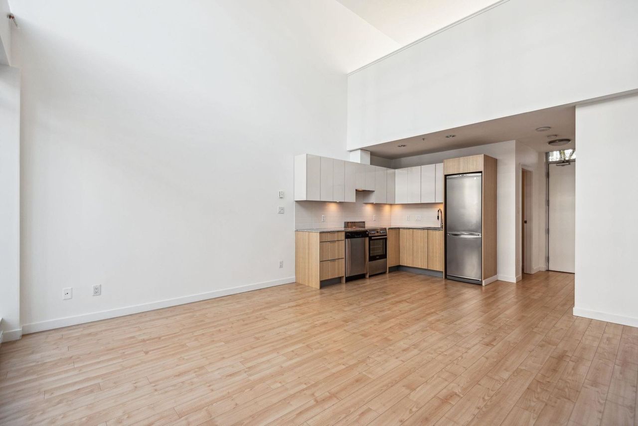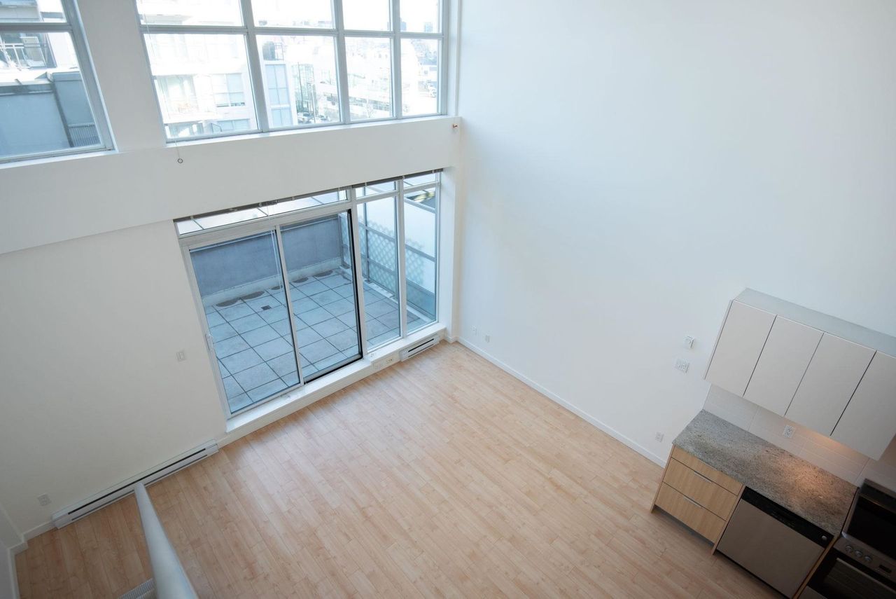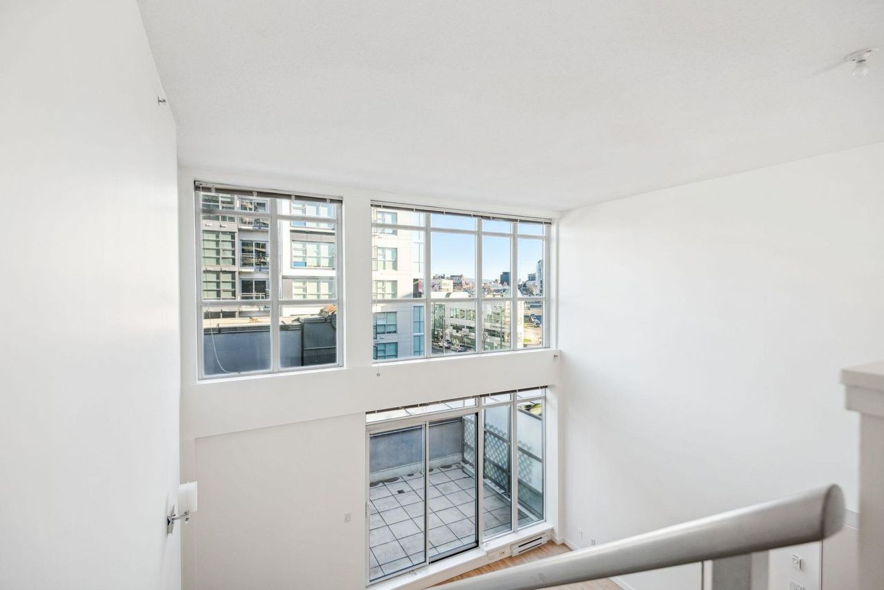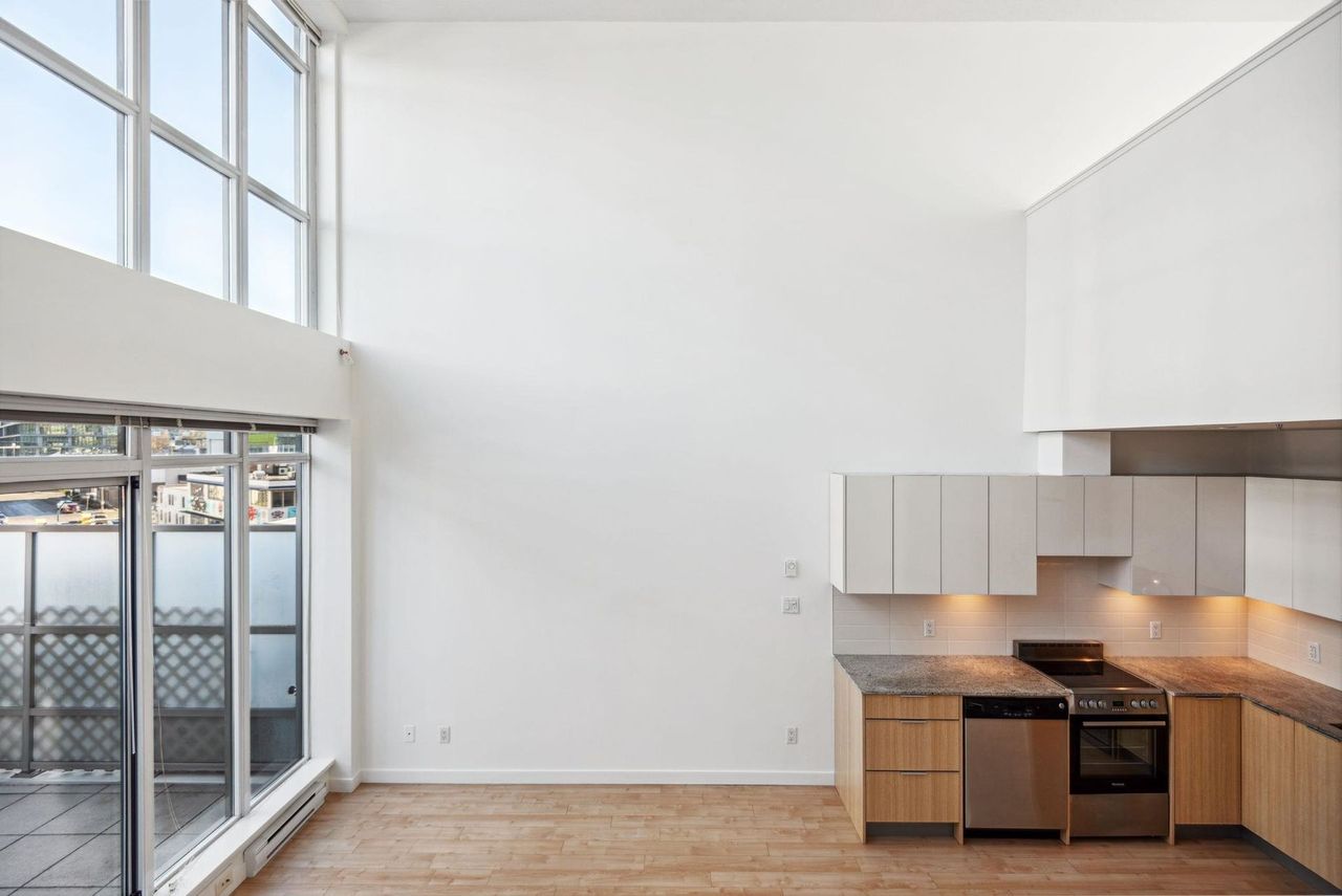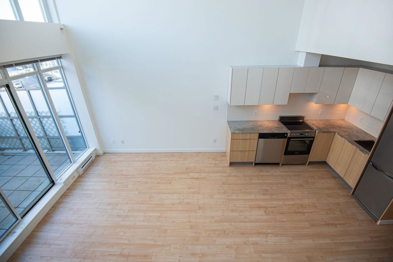 Stunning Two-Level Penthouse Loft at Maynards Block This one-of-a-kind modern penthouse loft sits atop a charming heritage brick building, featuring 17'6" ceilings, a striking double-height living room, and abundant natural light from its dual exposure. The spacious upstairs bedroom, two bathrooms, and sleek stone surfaces create a stylish, open-concept space. Enjoy a 118 sq. ft. walk-out patio with garden access. Two parking spaces included. Steps from Olympic Village, the SkyTrain, and the seawall. Call today to book your private showing!