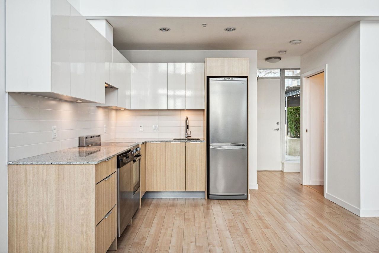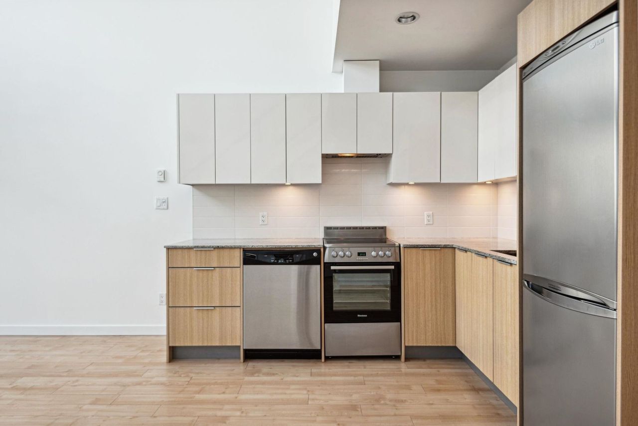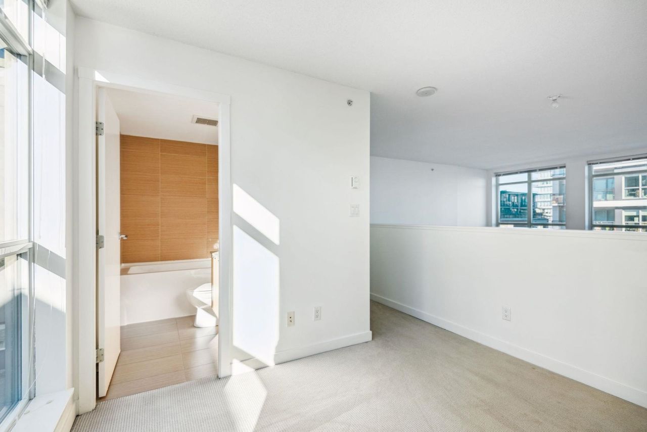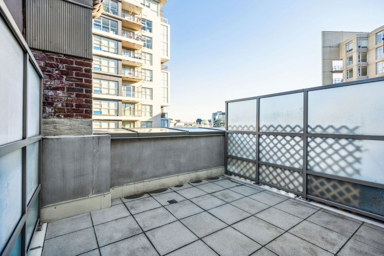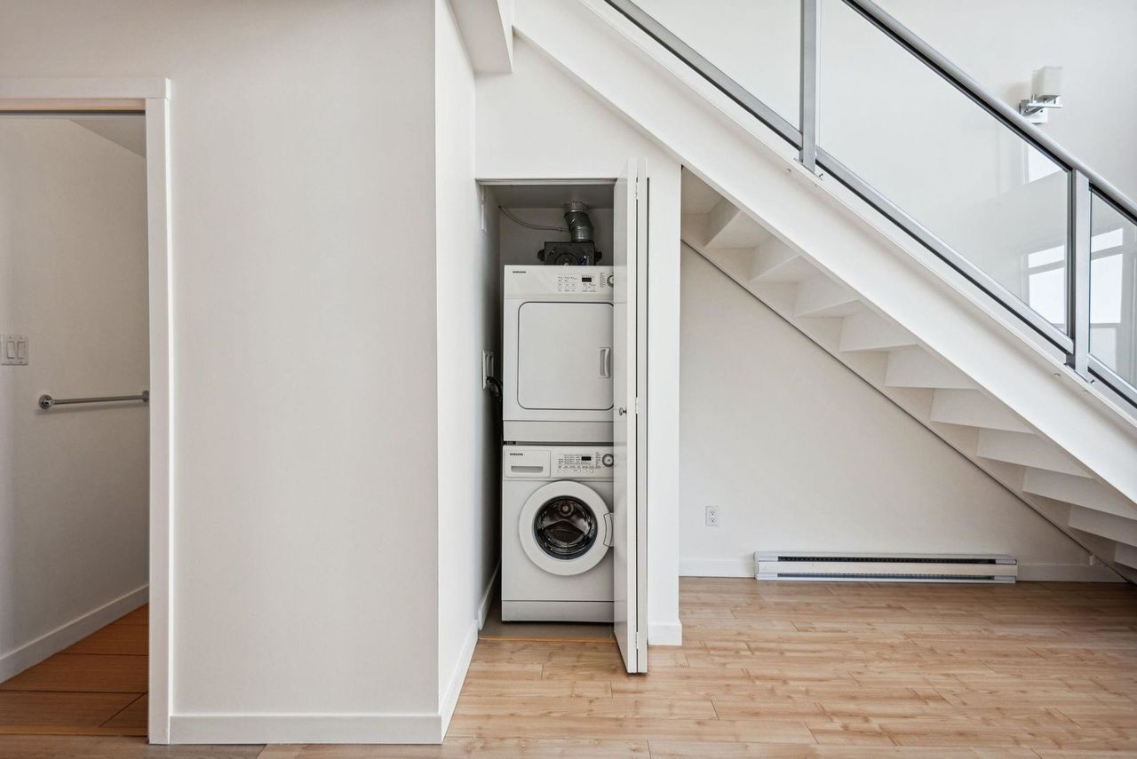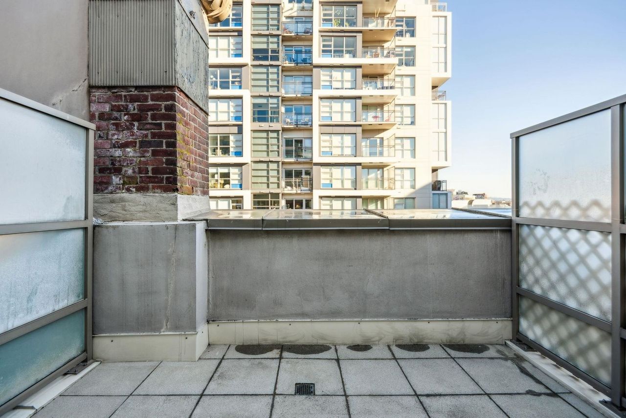Stunning Two-Level Penthouse Loft at Maynards Block This one-of-a-kind modern penthouse loft sits atop a charming heritage brick building, featuring 17'6" ceilings, a striking double-height living room, and abundant natural light from its dual exposure. The spacious upstairs bedroom, two bathrooms, and sleek stone surfaces create a stylish, open-concept space. Enjoy a 118 sq. ft. walk-out patio with garden access. Two parking spaces included. Steps from Olympic Village, the SkyTrain, and the seawall. Call today to book your private showing!