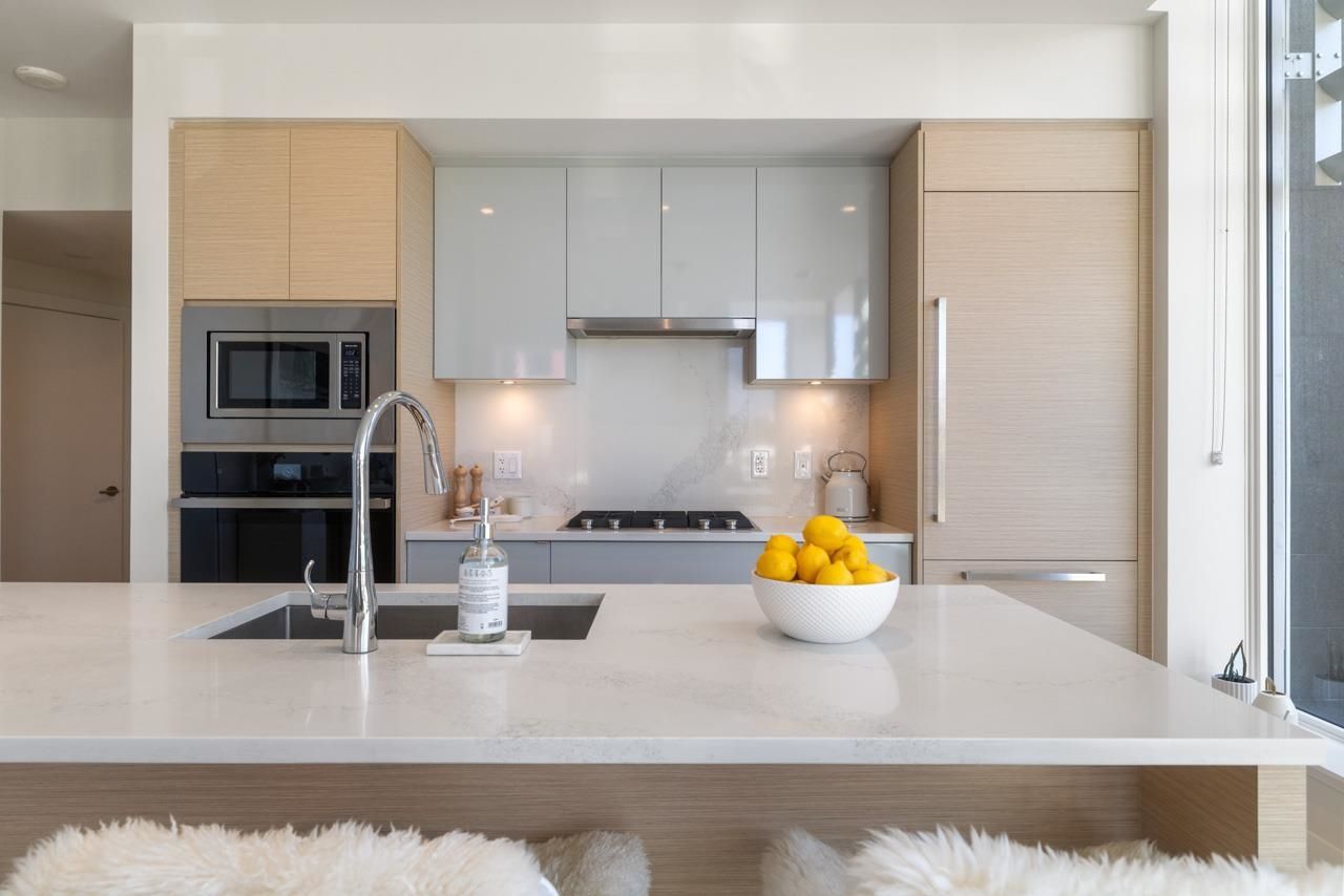 Best townhouse layout at MODE in the River District! Rare corner unit with 3 beds up, 3 baths, flex space, and 1,700+ sqft of smartly designed living. Bright and airy with oversized windows, two balconies, and great natural light. Upgrades include a custom wine bar w/ fridge and built-in coffee station. Gourmet kitchen features gas range, wall oven, integrated fridge/dishwasher, and quartz counters. South-facing with open layout, in-floor heating in primary ensuite, and high-efficiency heating/cooling system. Includes 2 parking and 1 storage. Enjoy resort-style amenities: hot tub, gym, concierge, theater, guest suites, dog wash, co-working hub & more. Steps to Save-On, Starbucks, restaurants, banks, wine shops, riverfront trails & more!