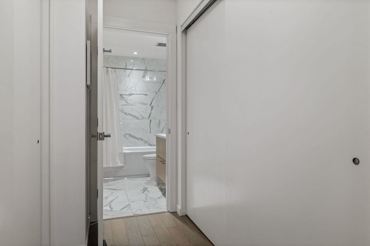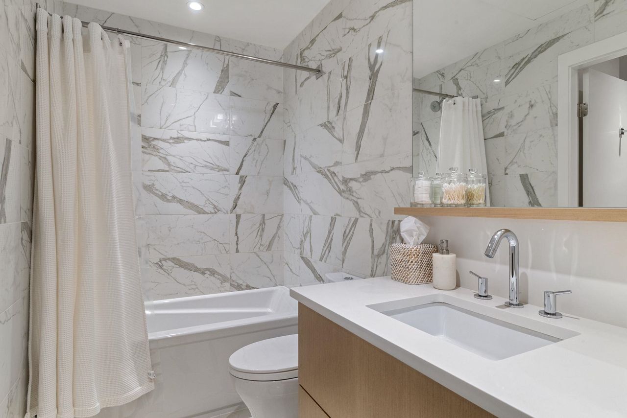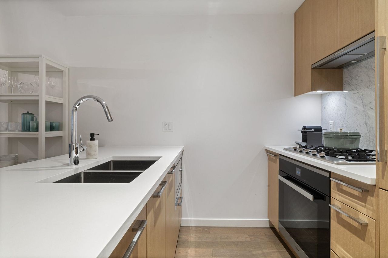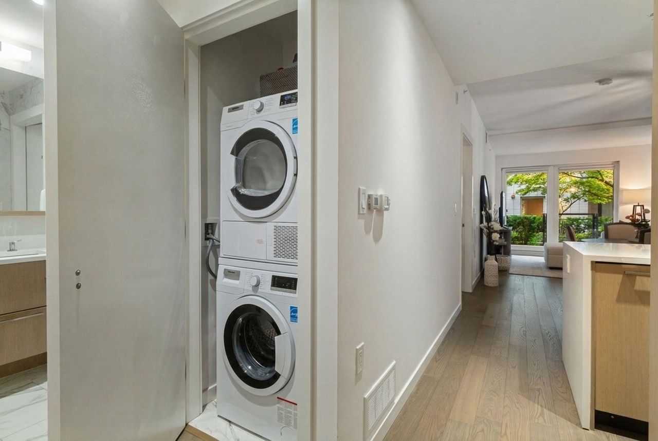Welcome to Henry, a boutique concrete building in he heart of Cambie Corridor, just steps from Queen Elizabeth Park. The well-designed 1 bed + den offers over 700 sqft of living space on the QUIET SIDE of the building. The functional layout include engineered hardwood floors, high ceilings, A/C, and a spacious covered patio perfect for year-round use. The kitchen is equipped with premium Miele appliances, a five-burner gas cooktop, and marble backsplash, white the spa-inspired bathroom features floor-to-ceiling marble-style tile and a deep soaker tub. 1 parking stall and 1 storage locker. Amenities include a meeting room and a rooftop Terrance with BBQ and city views. Unbeatable location just steps to Oakridge Park, Canada Line, parks, shops, and restaurants. OPEN HOUSE: Sat/ Sun 2-4